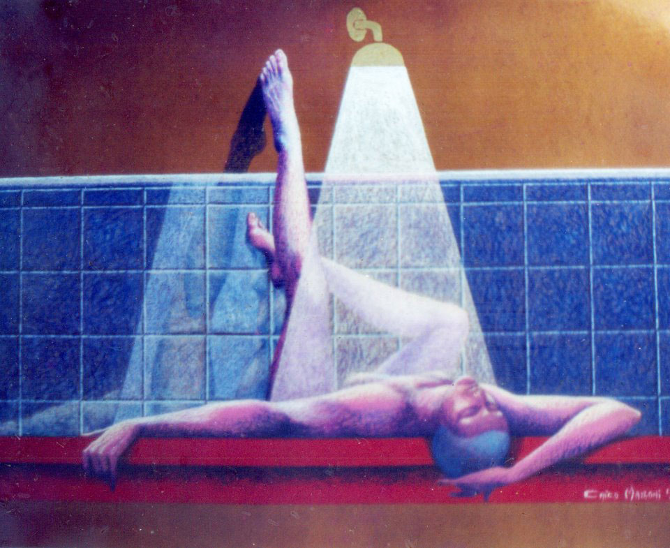 “Uma boa indicação do Instituto Goethe de salvador ao escolher o intrigante trabalho de Chico Mazzoni para a reinauguração de sua galeria de arte, que já foi uma das mais importantes de Salvador. Nessa amostra, o que chama a atenção é a combinação entre as peças, ou mais tecnicamente a complementariedade, como se fossem casais de quadros, embora tenham sido pintados isoladamente. São desenhos e pinturas sobre papelão, com temas variados, num estilo voltado para os ambientes sob penumbra – como em Banho Lilás, um belíssimo trabalho em que a água jorra do chuveiro e se transforma em jato de luz, ressaltando uma mulher nua. Mas o mais belo é o Faces da Lua, o escolhido para ilustrar o convite, que mostra perfis à la Cleópatra que se complementam dentro de um círculo.”